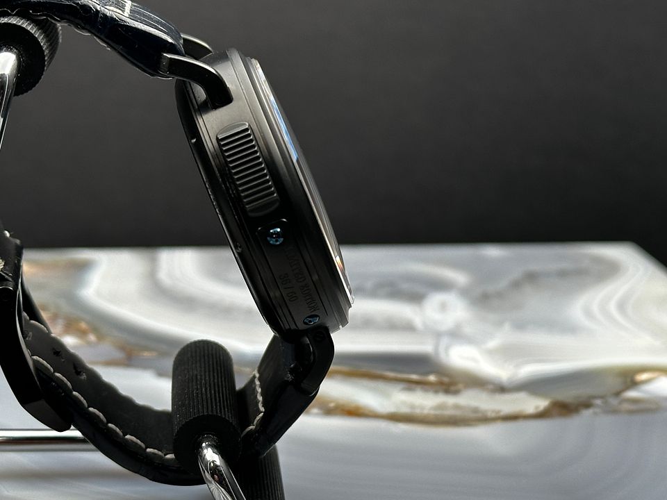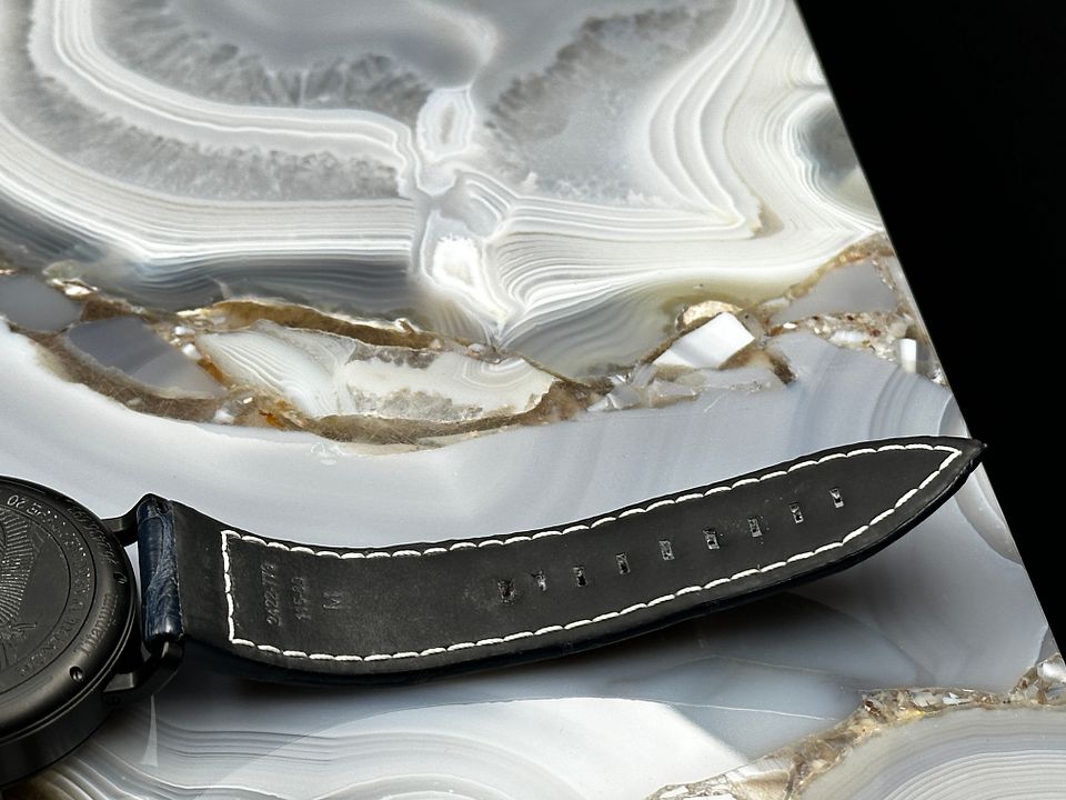 Black DLC coated titanium case with a blue leather strap